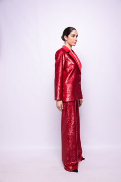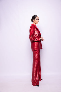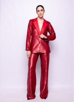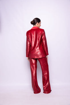 Veste confectionnée en sequins rouges mats. Elle présente un col cranté, une fermeture sur le devant et une doublure ...