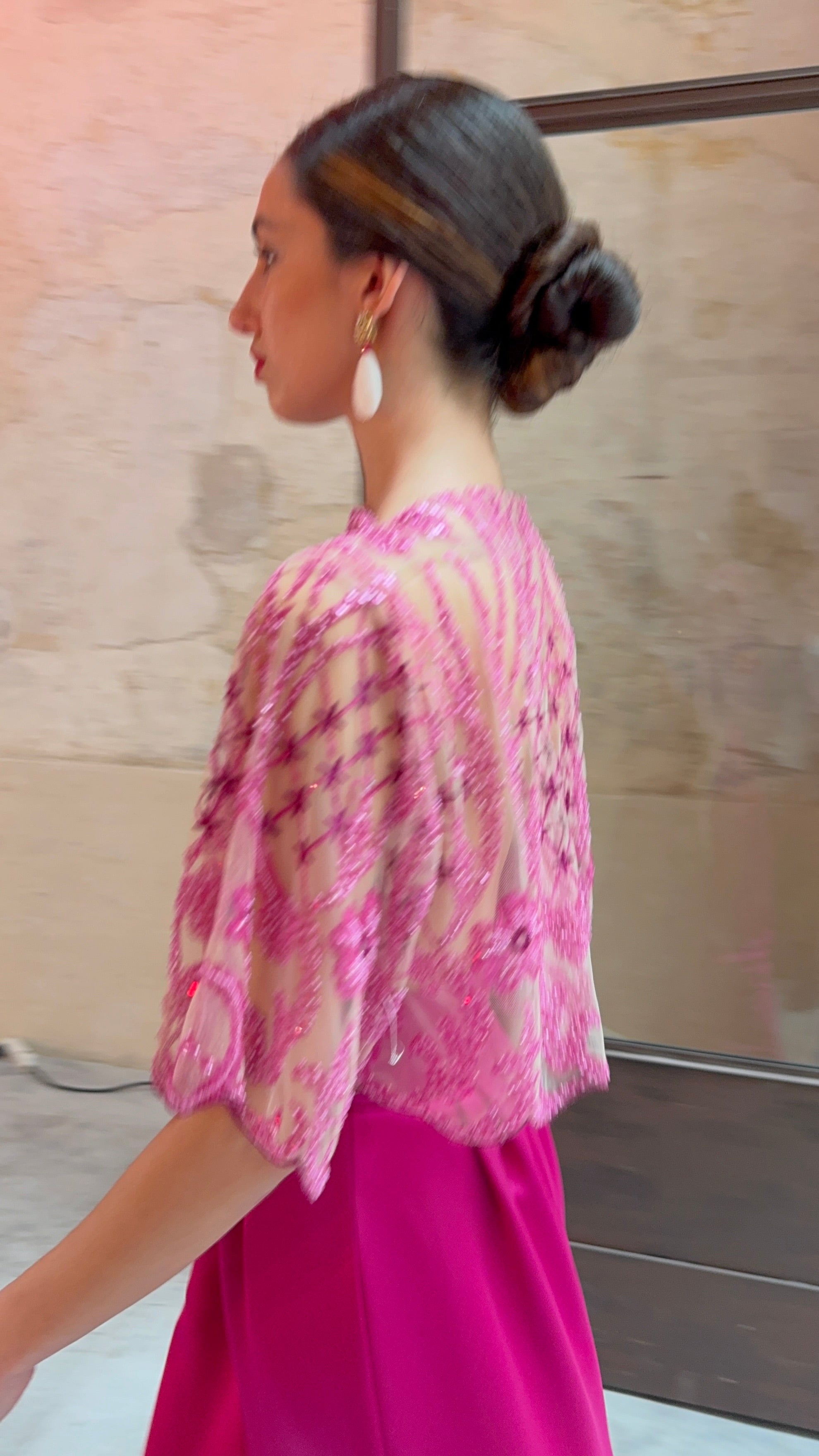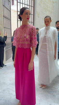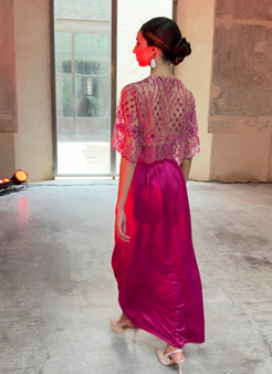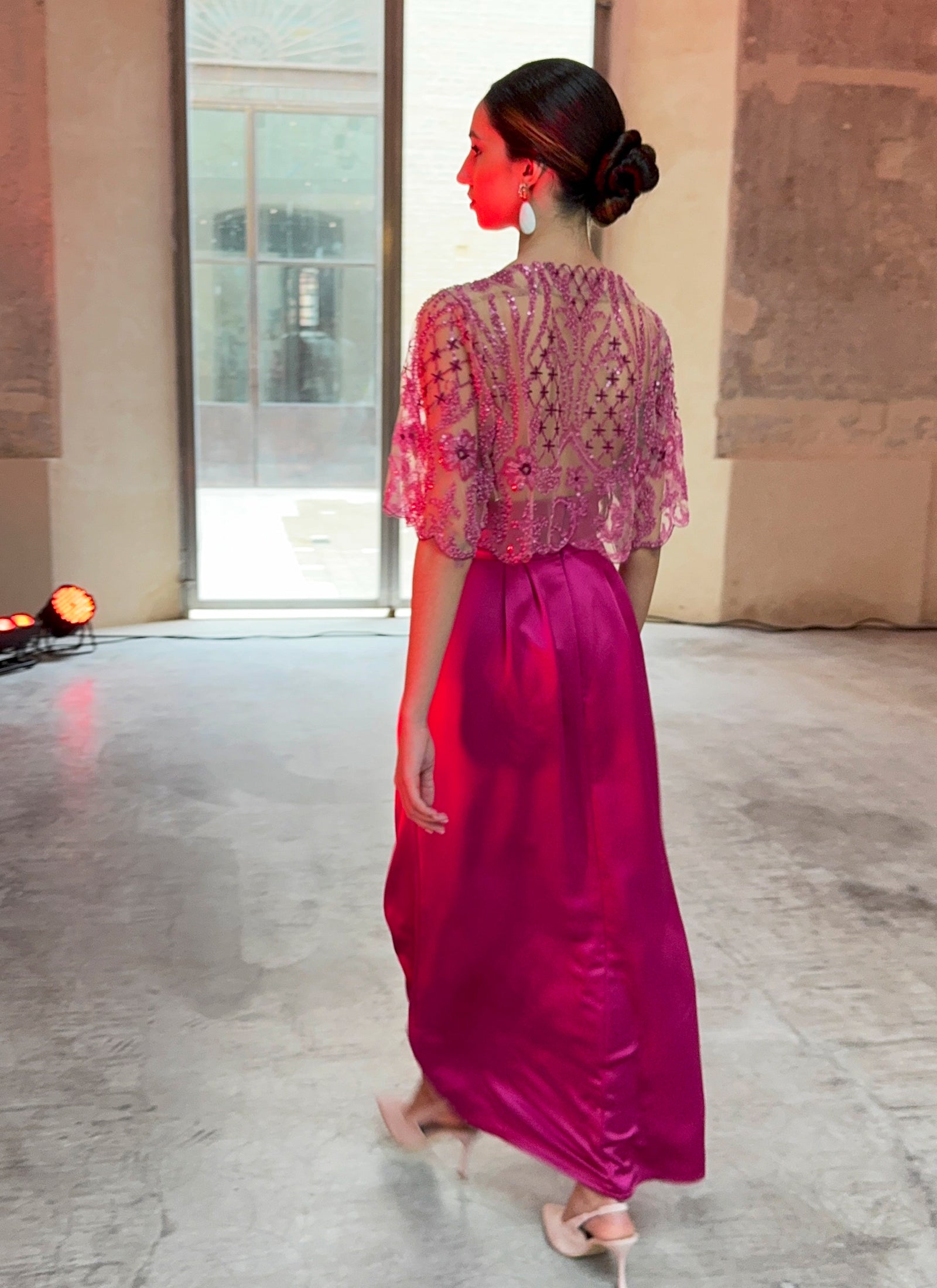 La jupe, en satin, offre un drapé doux et fluide, tandis que le corsage est en tissu transparent brodé de sequins fuc...