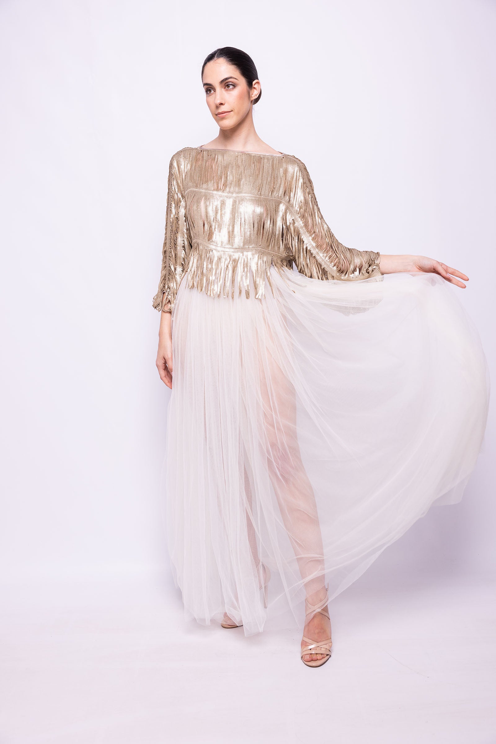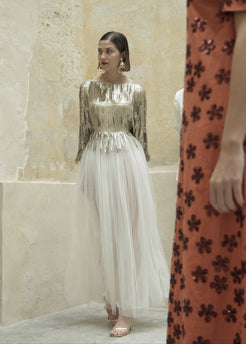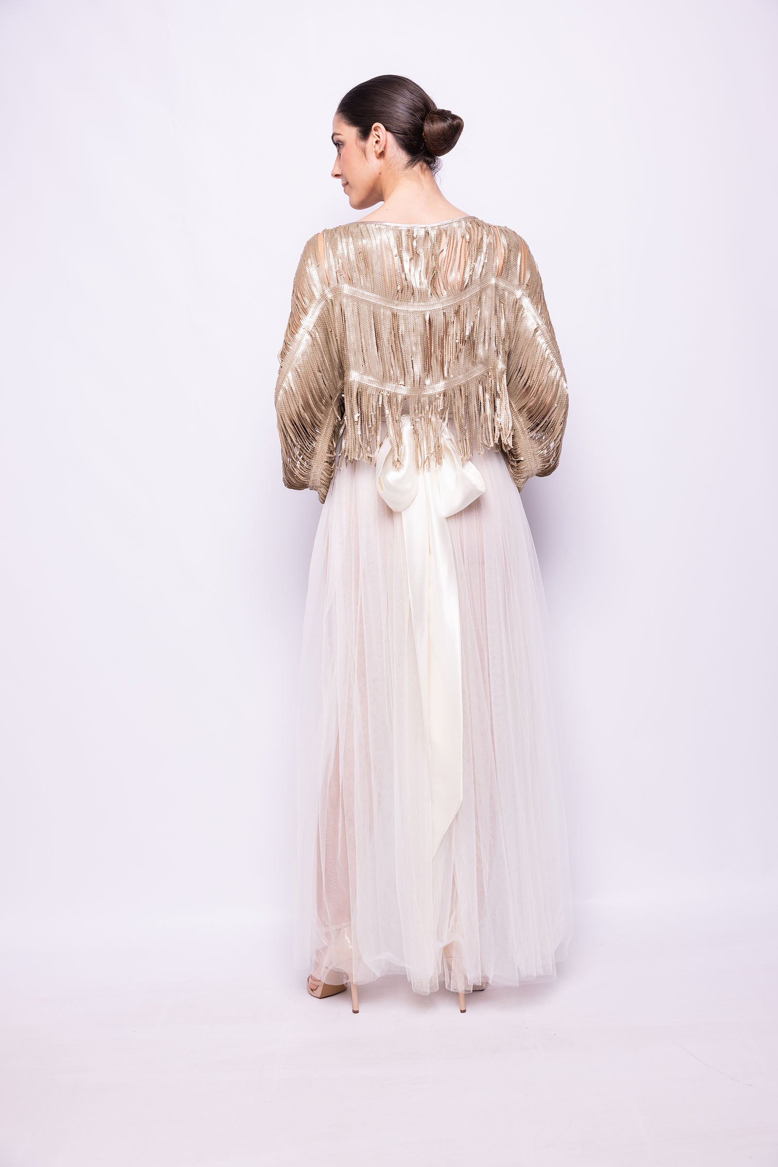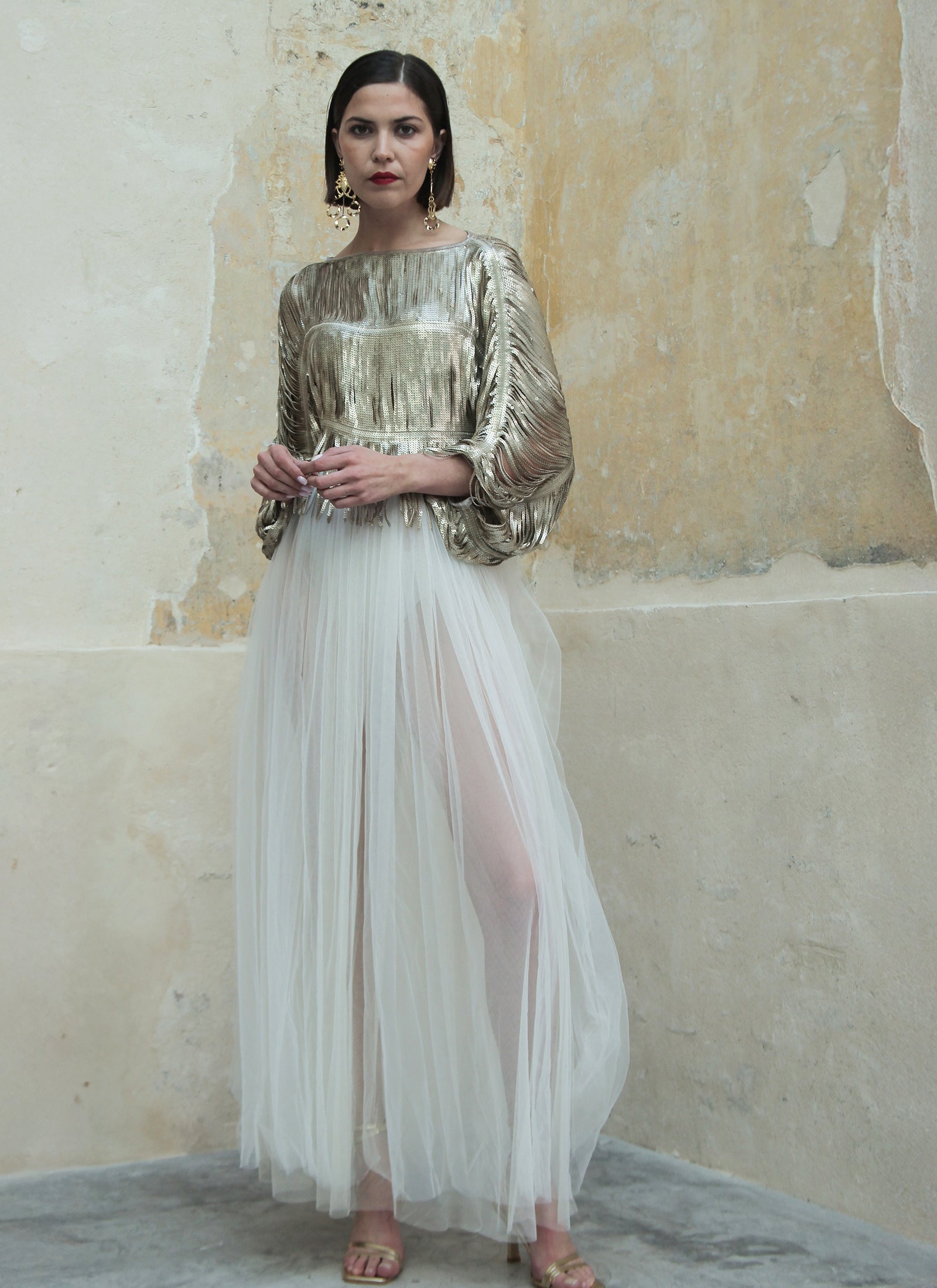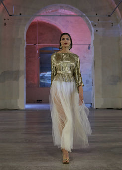 La jupe en tulle ivoire de notre collection N7 est la pièce maîtresse d'une allure élégante et fluide. Une jupe midi...