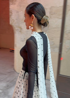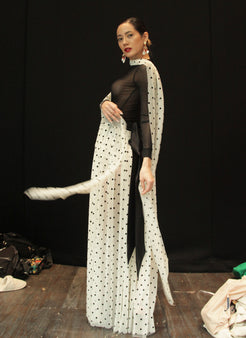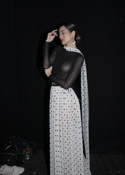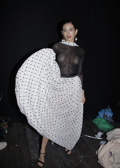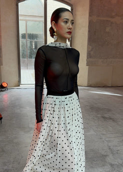 Jupe en tulle de viscose souple à pois noirs veloutés, créant un contraste élégant et raffiné. L'association des text...