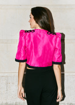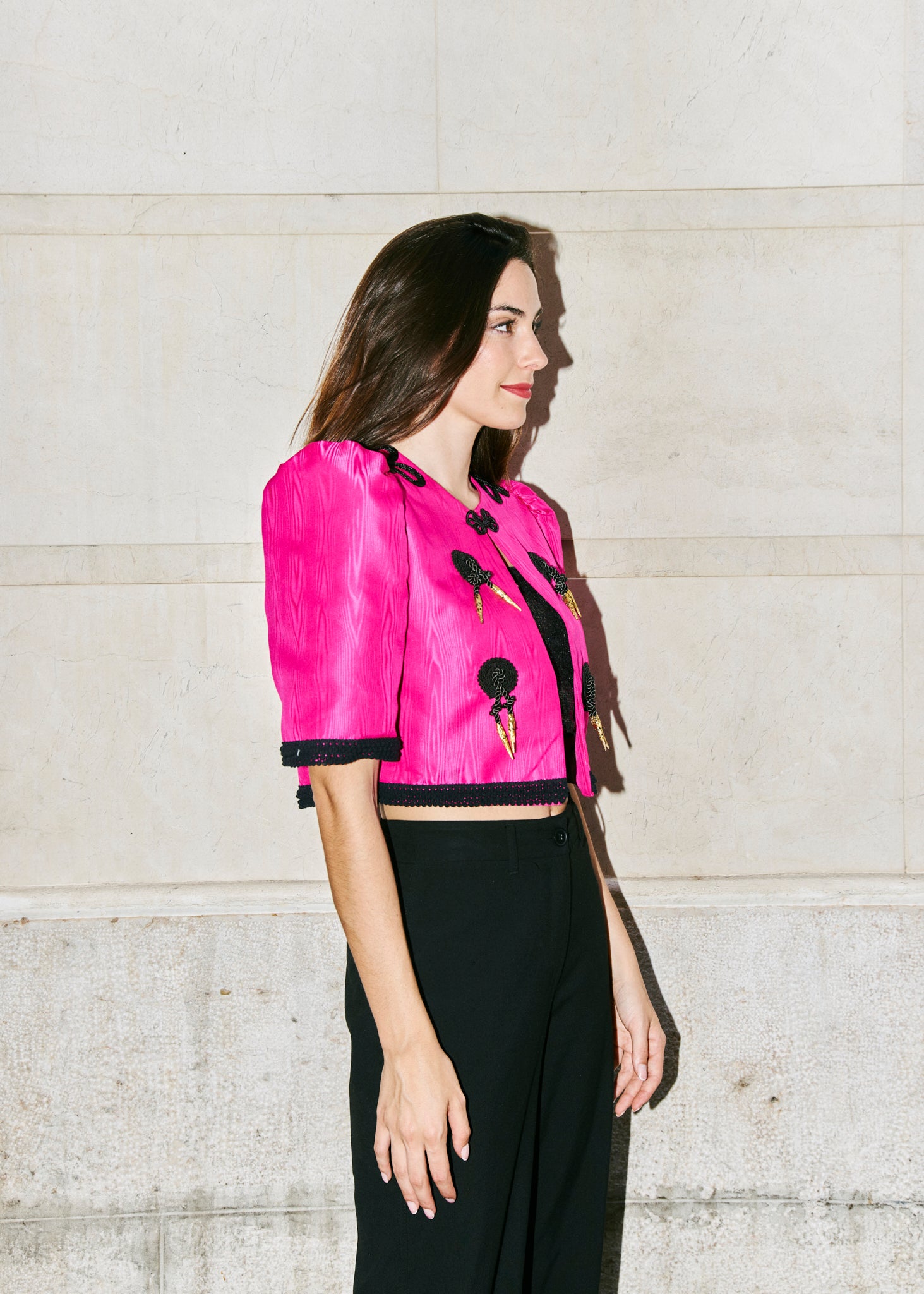 Veste style Goya en tissu moiré rose fuchsia contrastant avec des finitions noires et dorées.