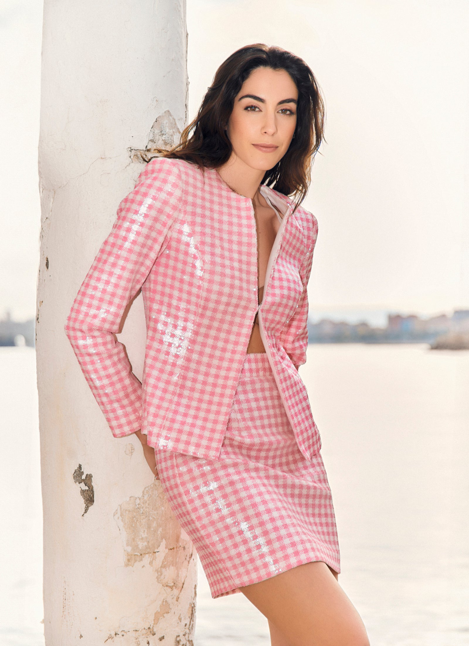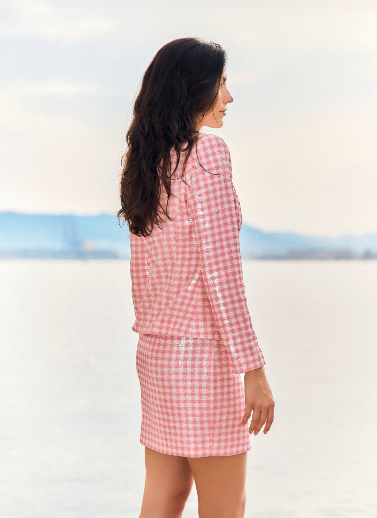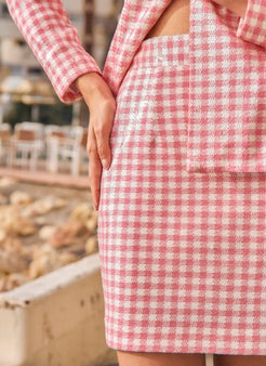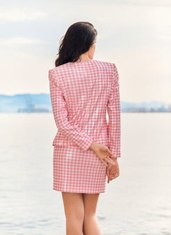 Découvrez la polyvalence enchanteresse d'AURORA, un tailleur jupe rose et blanc à micro-paillettes et imprimé vichy, parfait pour toutes les occasions, des événements formels aux tenues décontractées, qui apportera une touche unique à votre style.