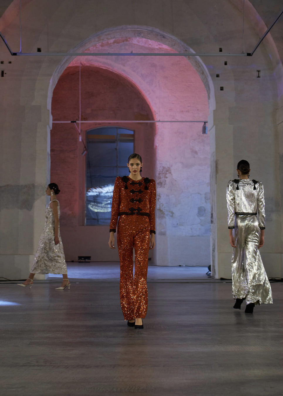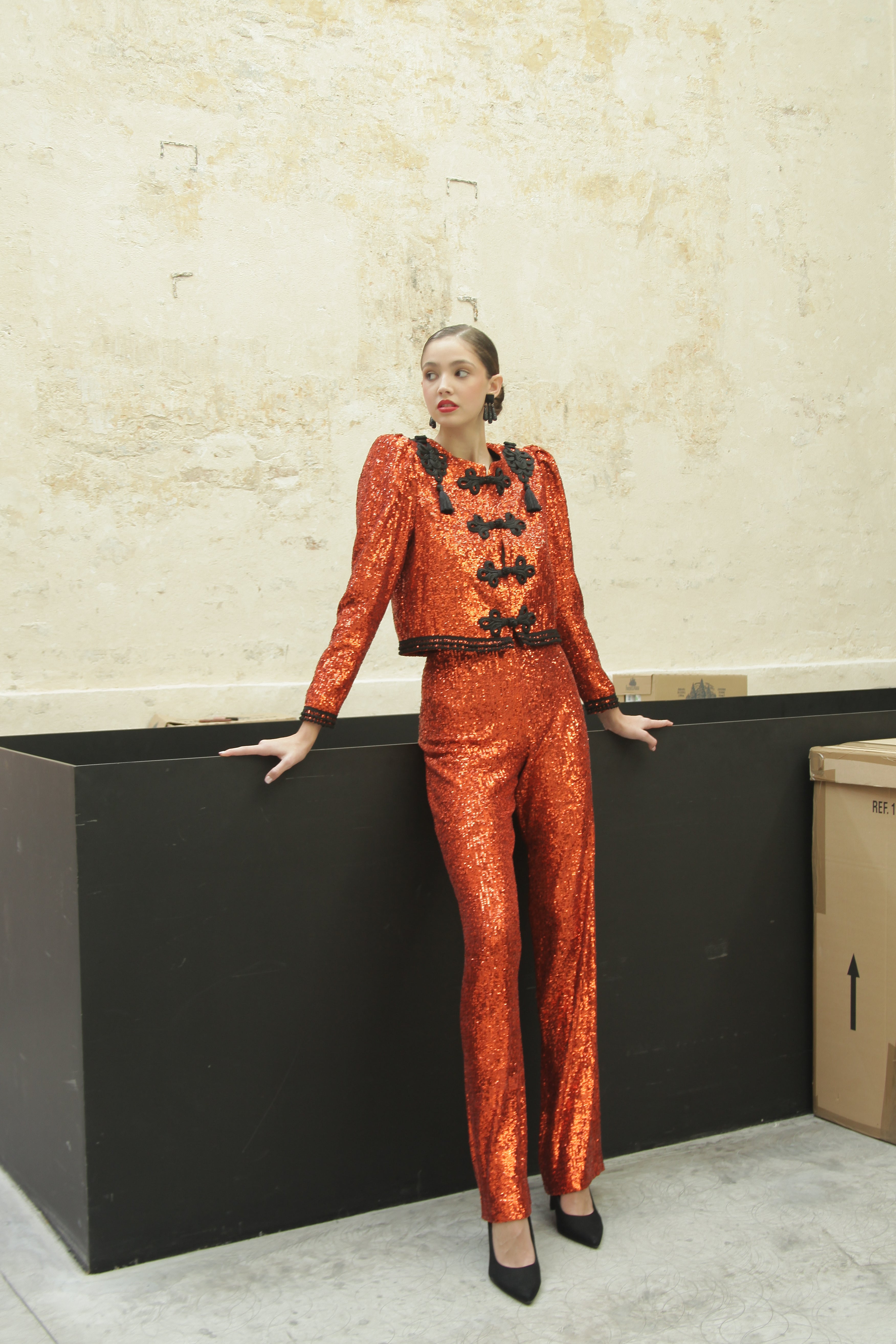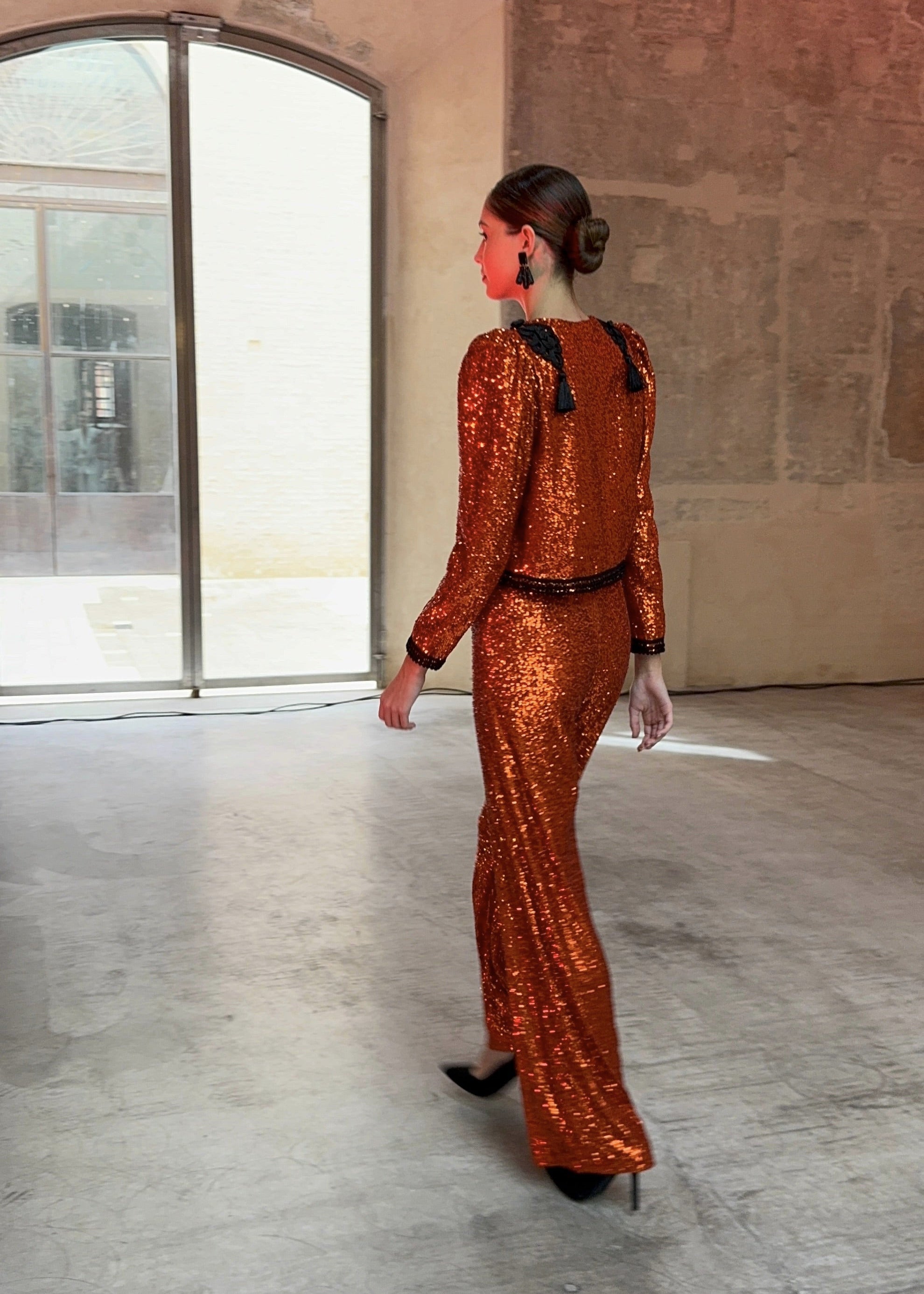 Notre Goyesca en sequins orange : une structure définie, des finitions cousues main et un tissu élastique qui s'adap...