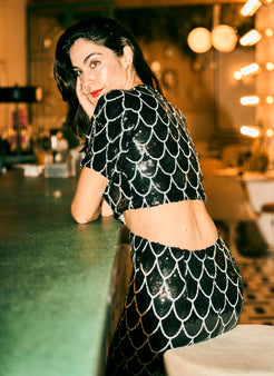 Robe midi à sequins avec un motif ondulé, des découpes sur les côtés et un tissu extensible qui met en valeur la sil...