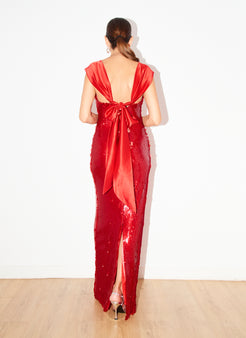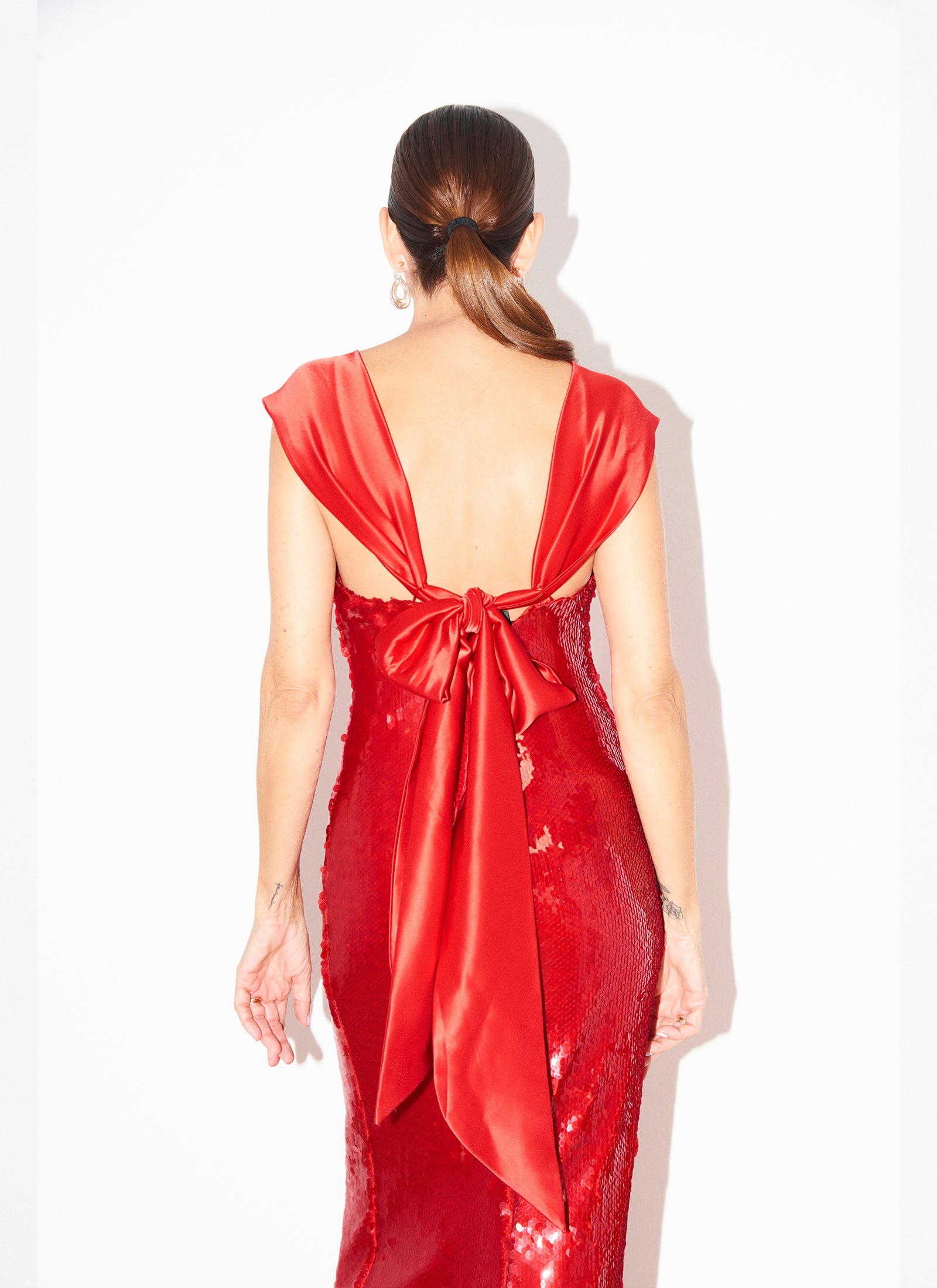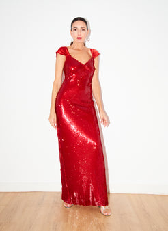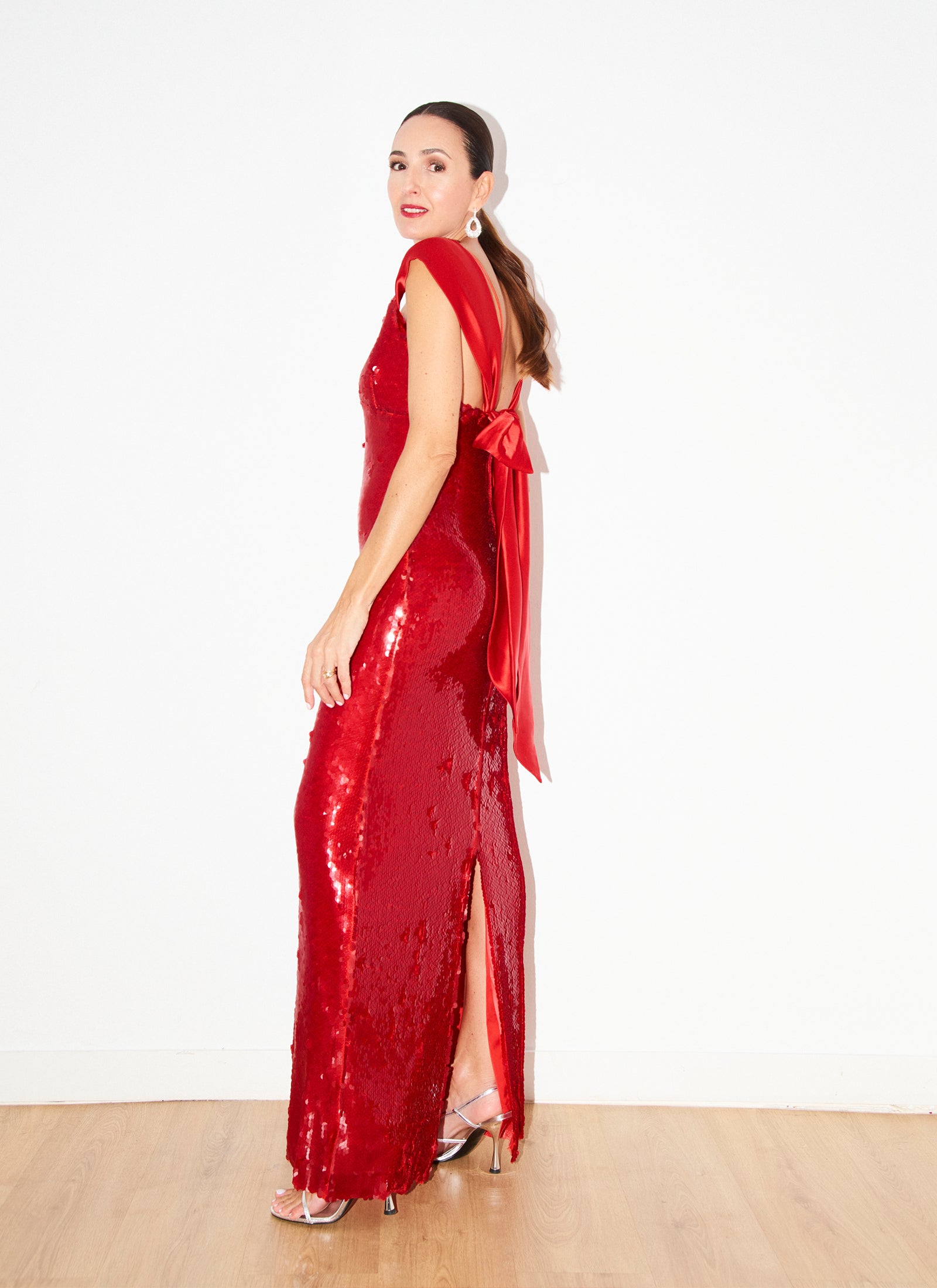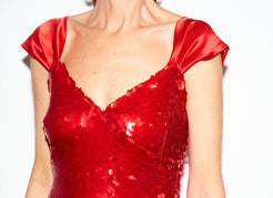 Cette longue robe rouge à sequins est de coupe ajustée et présente un col en V, une conception sans manches avec une...