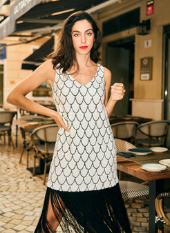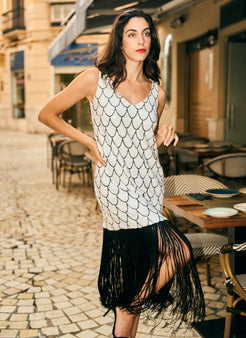 Robe en viscose avec base élastique et motif à franges et sequins.