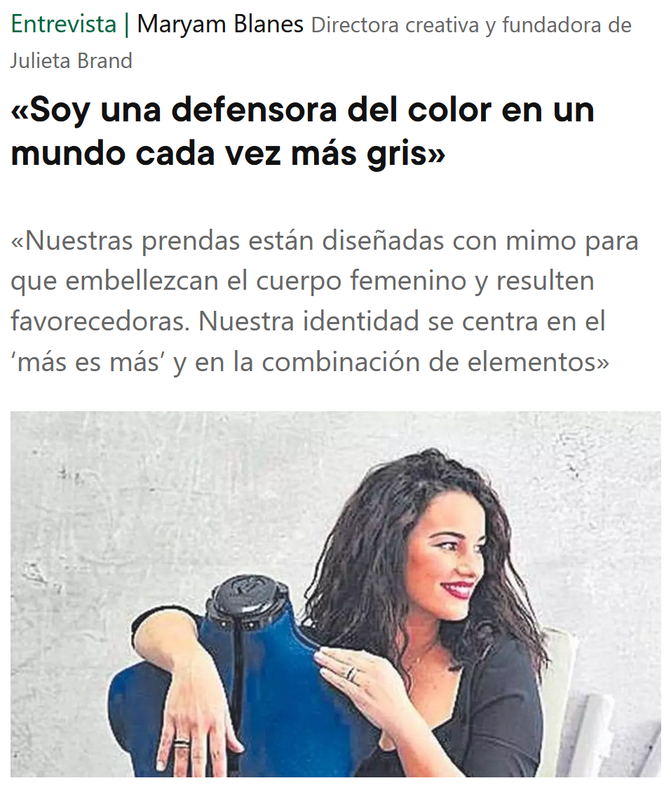 «Soy una defensora del color en un mundo cada vez más gris. Nuestras prendas están diseñadas con mimo para que embellezcan el cuerpo femenino y resulten favorecedoras. Nuestra identidad se centra en el ‘más es más’ y en la combinación de elementos». Artículo