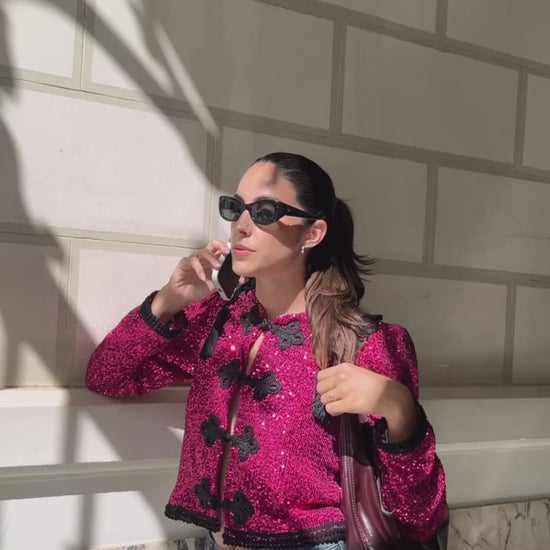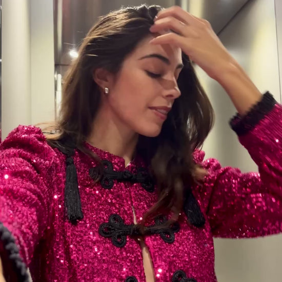 Nuestra Goyesca en lentejuelas en color fucsia: hombro definido, fornituras cosidas a mano y una presencia bruuutal que eleva cualquier outfit.