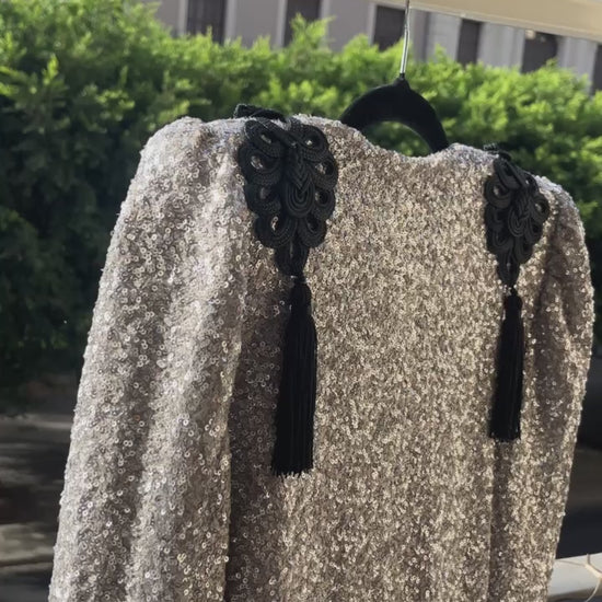 Nuestra Goyesca en lentejuelas en color plata: hombro definido, fornituras cosidas a mano y una presencia que eleva cualquier outfit.