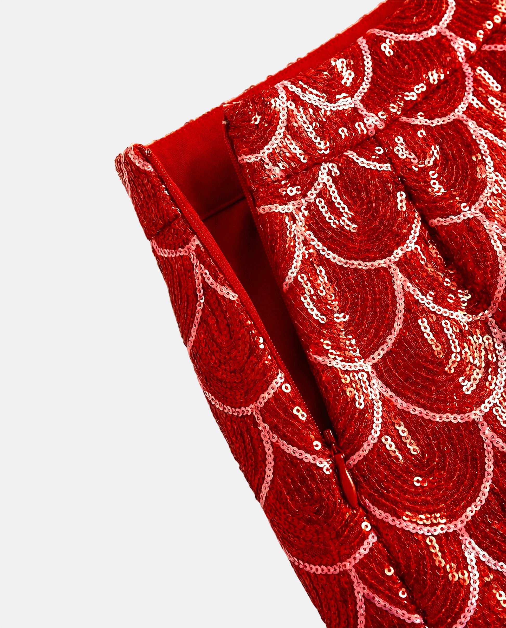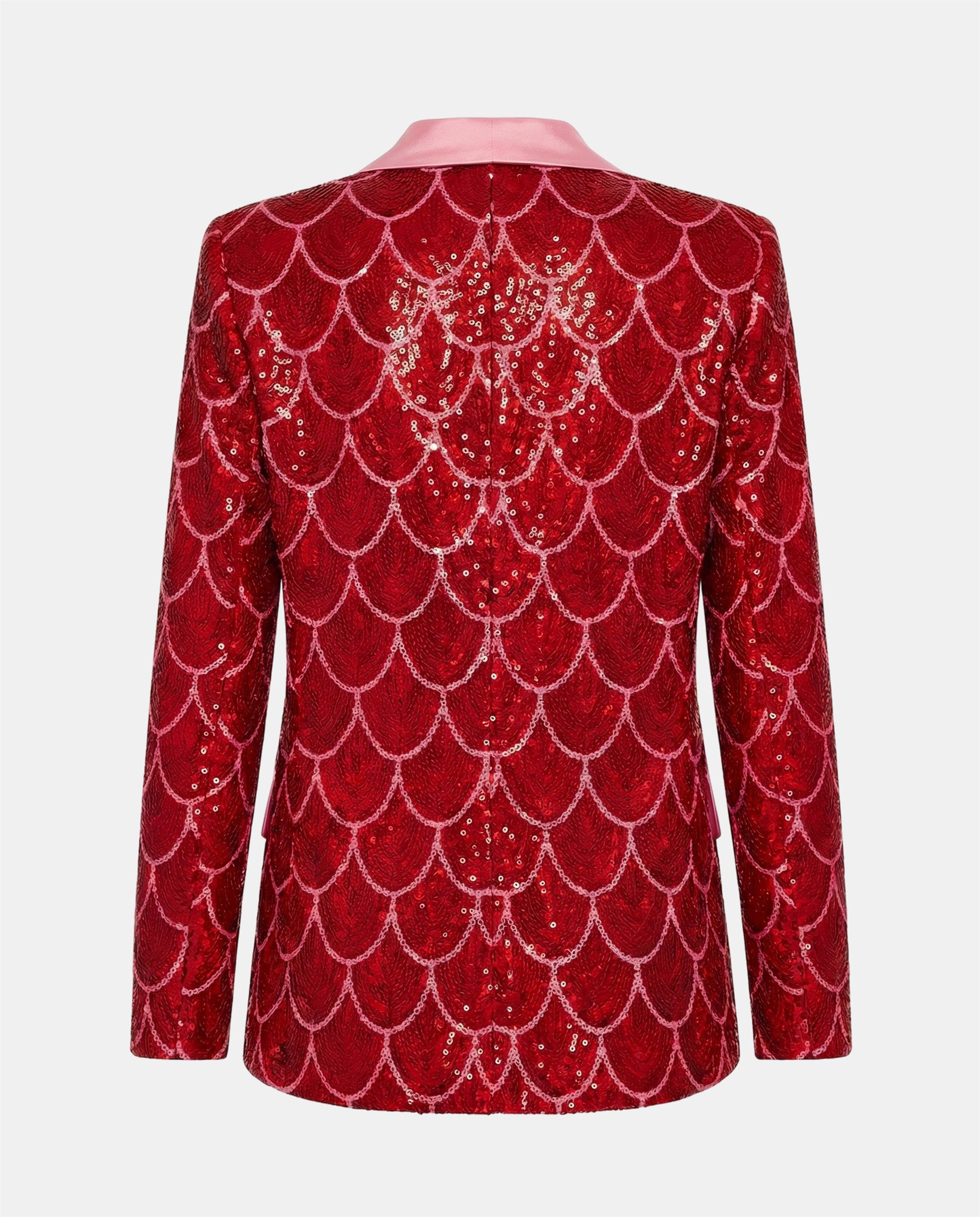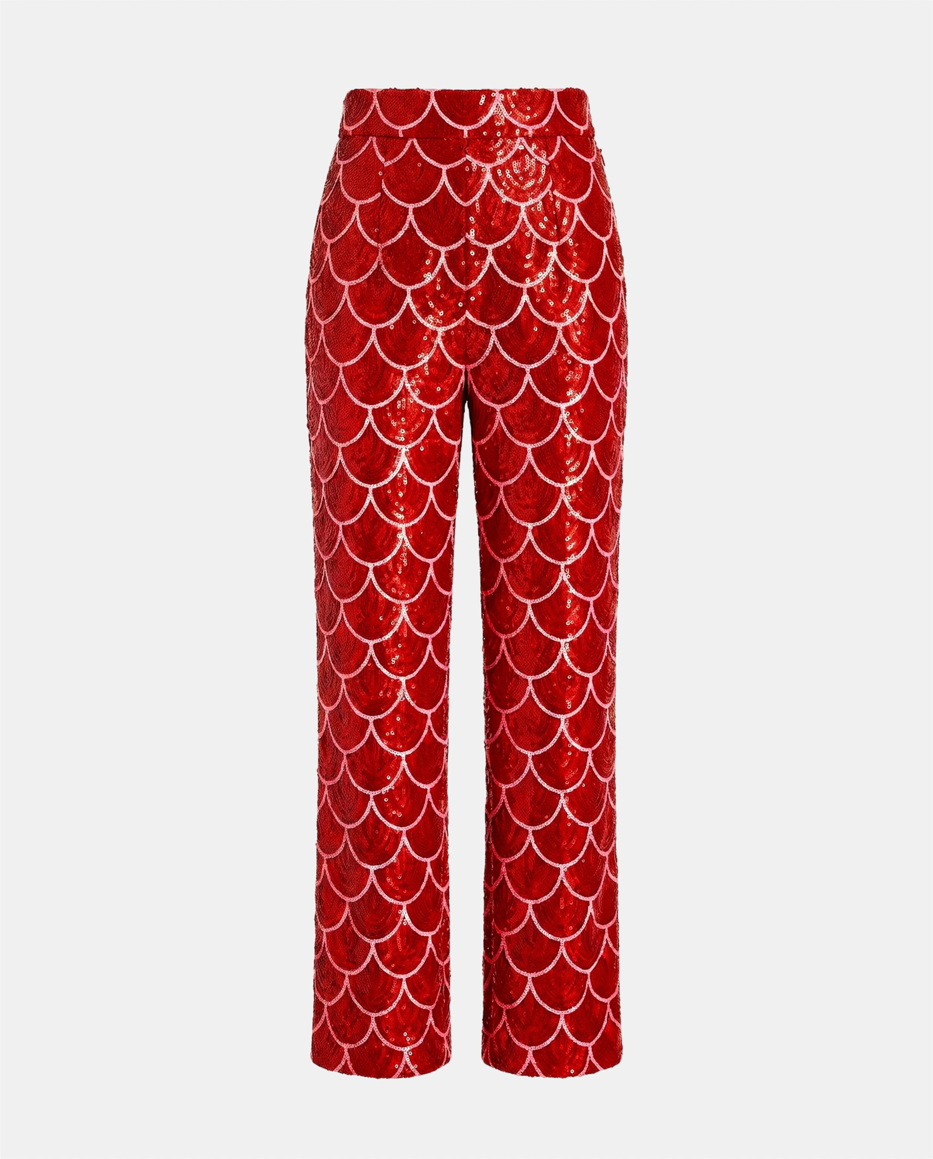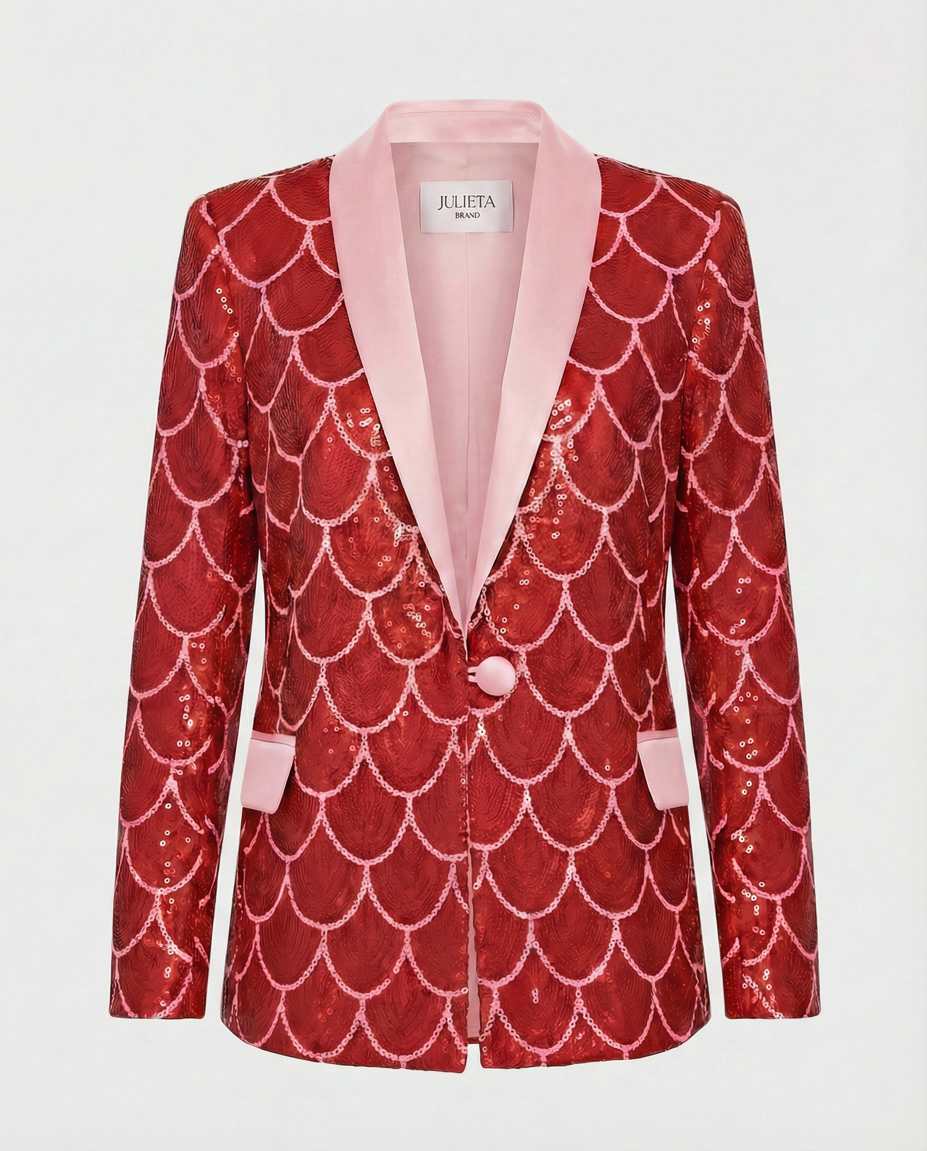 Traje de dos piezas confeccionado en tejido estampado en lentejuela rosa y roja con el icónico motivo de ondas de JULIETA.