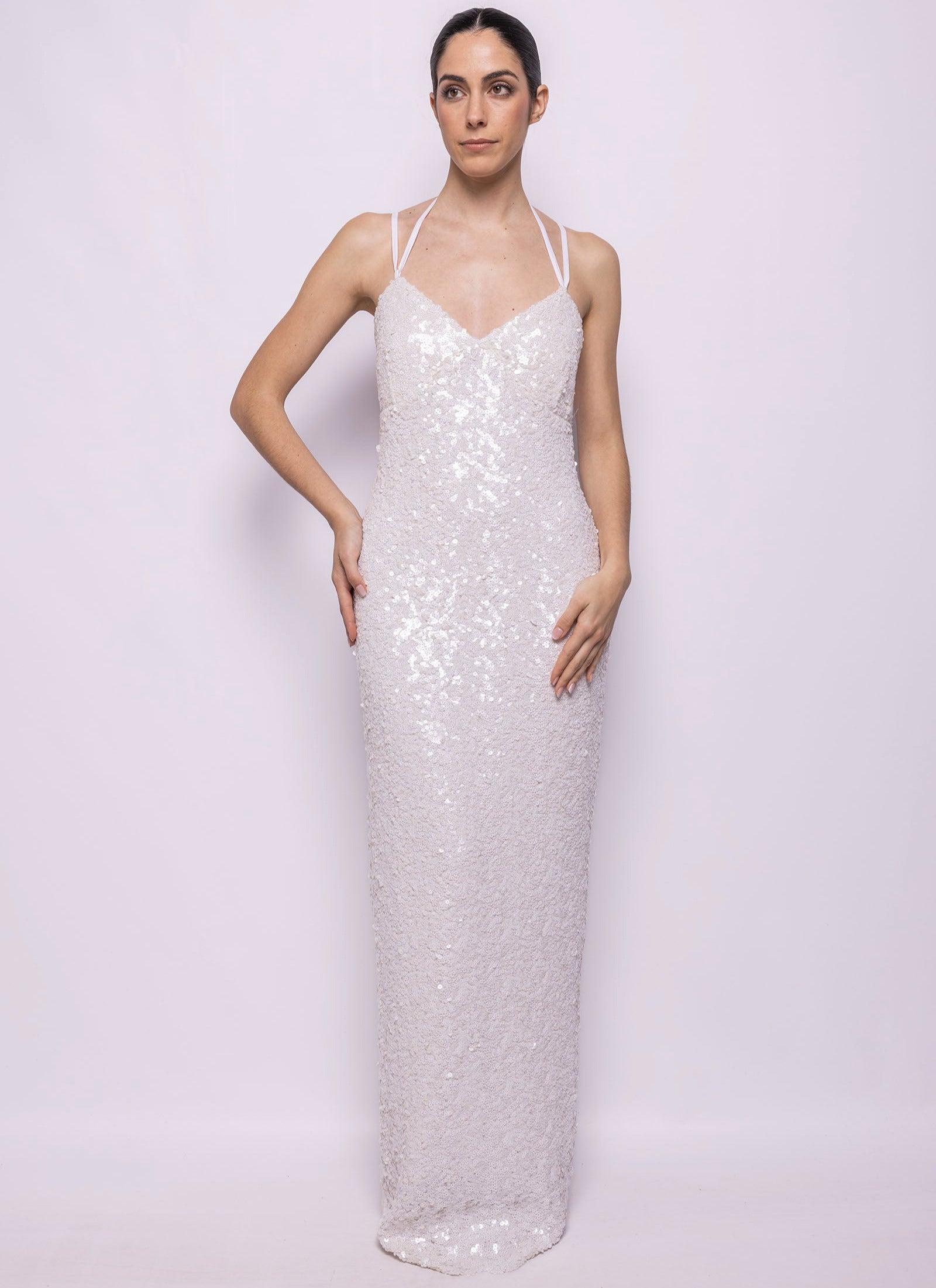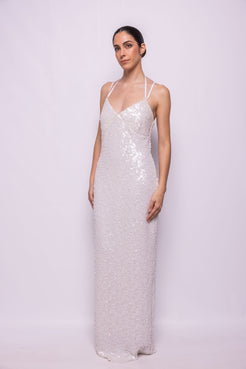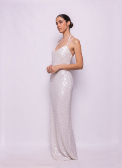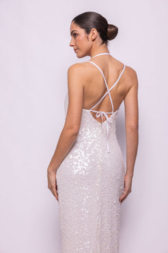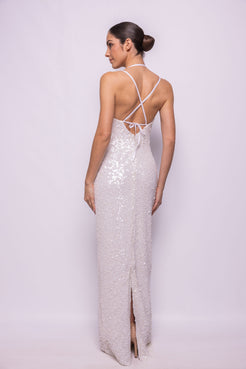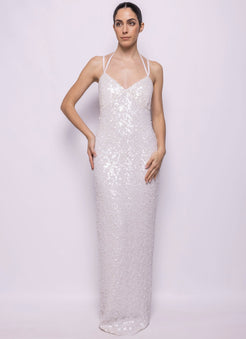 VESTIDO LARGO EN LENTEJUELA TRIDIMENSIONAL BLANCA